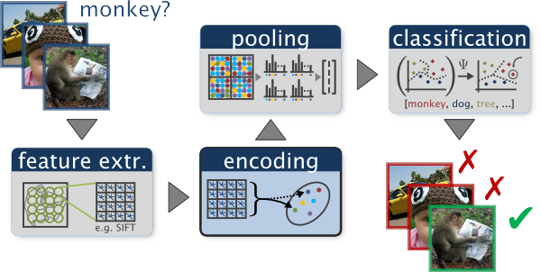 Quantize local features into a "vocabulary", describing images as histograms of "visual words", train classifiers to recognize scenes based on these histograms